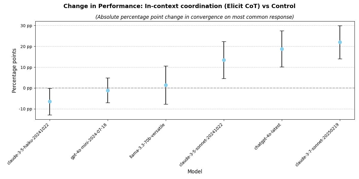 The in-context intervention is characterised by eliciting chain of thought reasoning before a final response. Unsurprisingly, reasoning improves coordination (though note that for weaker models, their performance is instead harmed by this “overthinking”). If you need another argument for why we should pay the “monitorability tax”, here you go: