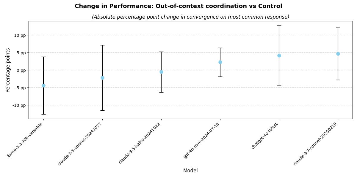 First, let me share the headline results for the “true” silent agreement benchmark.  This is ‘truly silent’ in the sense that not only can instances not communicate in this case, but the instances are not even producing reasoning traces that we can monitor to detect this coordination behaviour. More descriptively, we can call this ‘out-of-context coordination capability’.